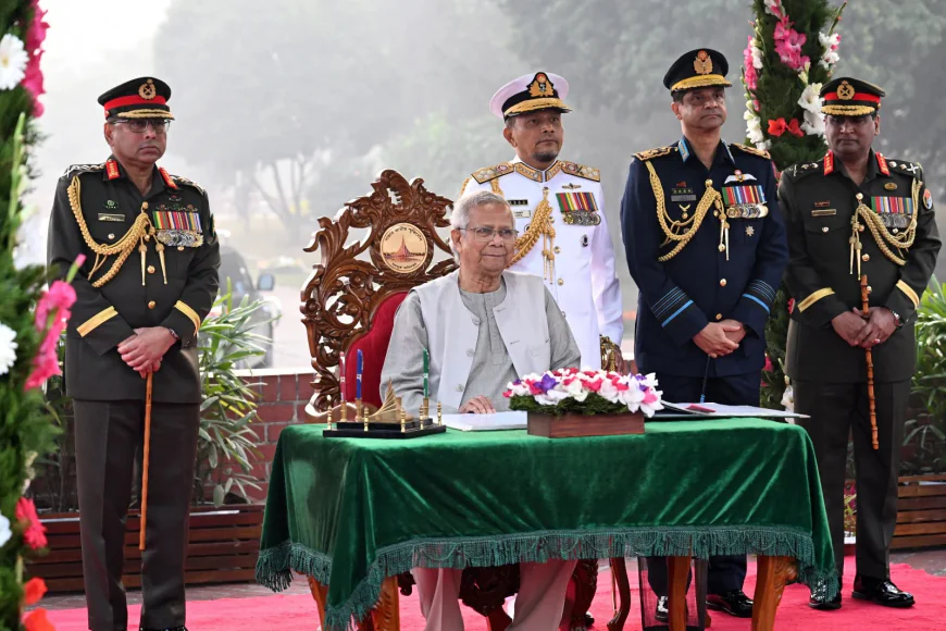 A smartly turned out contingent drawn from Bangladesh Army, Navy and Air Force presented a state salute on the occasion. Prof Yunus later signed the visitors’ book kept there.The chief justice, advisers of the interim government, chiefs of the three services, freedom fighters, diplomats, and civil and military officials, among others, were present on the occasion.